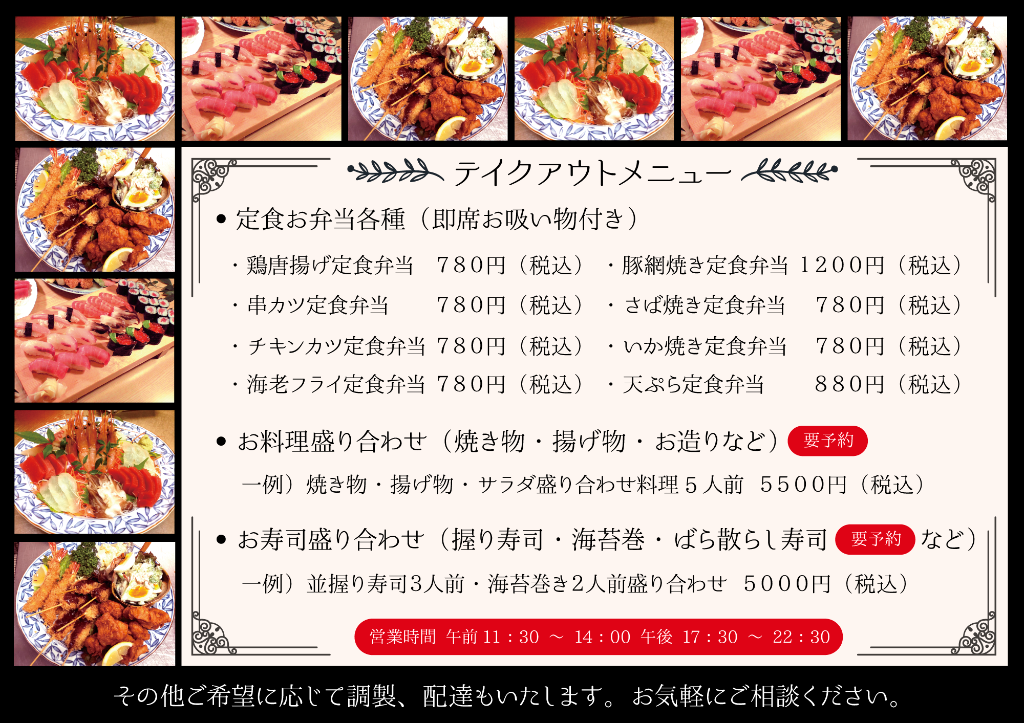 テイクアウトでお料理合わせ、お寿司盛り合わせ、ご用意できます。